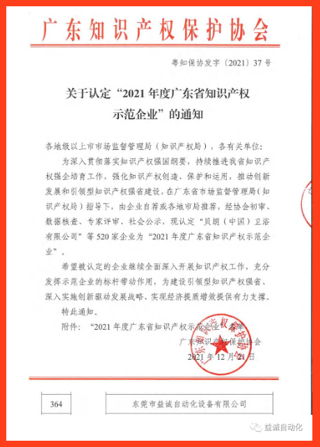 榮獲“2021年度廣東省知識(shí)產(chǎn)權(quán)示范企業(yè)”稱號(hào)