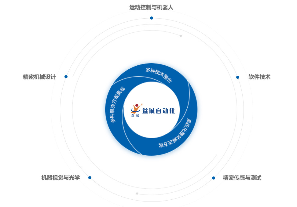 益誠自動(dòng)化成立于2007年,已通過ISO9001:2015質(zhì)量管理體系認(rèn)證,是一家高新技術(shù)企業(yè),東莞市工程技術(shù)研究中心,設(shè)有一個(gè)博士工作站??偣疚挥趶V東省東莞市,在沈陽、蘇州、印度尼西亞設(shè)有分公司,在香港特別行政區(qū)和德國設(shè)有辦事處。并與2021年在浙江、韶關(guān)自建智能制造工業(yè)科技園。益誠自成立以來專業(yè)從事非標(biāo)自動(dòng)化生產(chǎn)設(shè)備、視覺定位與檢測、工業(yè)多軸機(jī)器人的研發(fā)、制造與服務(wù),以及為生產(chǎn)企業(yè)提供智能制造整體解決方案。益誠擁有一支由100余名專業(yè)工程開發(fā)人員組成的研發(fā)團(tuán)隊(duì)。在汽車配件、電子電器開關(guān)插座、精密微型馬達(dá)、散熱風(fēng)扇、機(jī)械手等生產(chǎn)領(lǐng)域,為各生產(chǎn)企業(yè)提供多元化的自動(dòng)化解決方案。為使益誠的研發(fā)能力能得到持續(xù)提升,為市場提供更優(yōu)質(zhì)的服務(wù),益誠與國內(nèi)多家高等院校建立了”產(chǎn)、學(xué)、研“合作關(guān)系,并與德國著名的自動(dòng)化設(shè)備制造商”SUSO Automation“結(jié)成戰(zhàn)略合作伙伴。